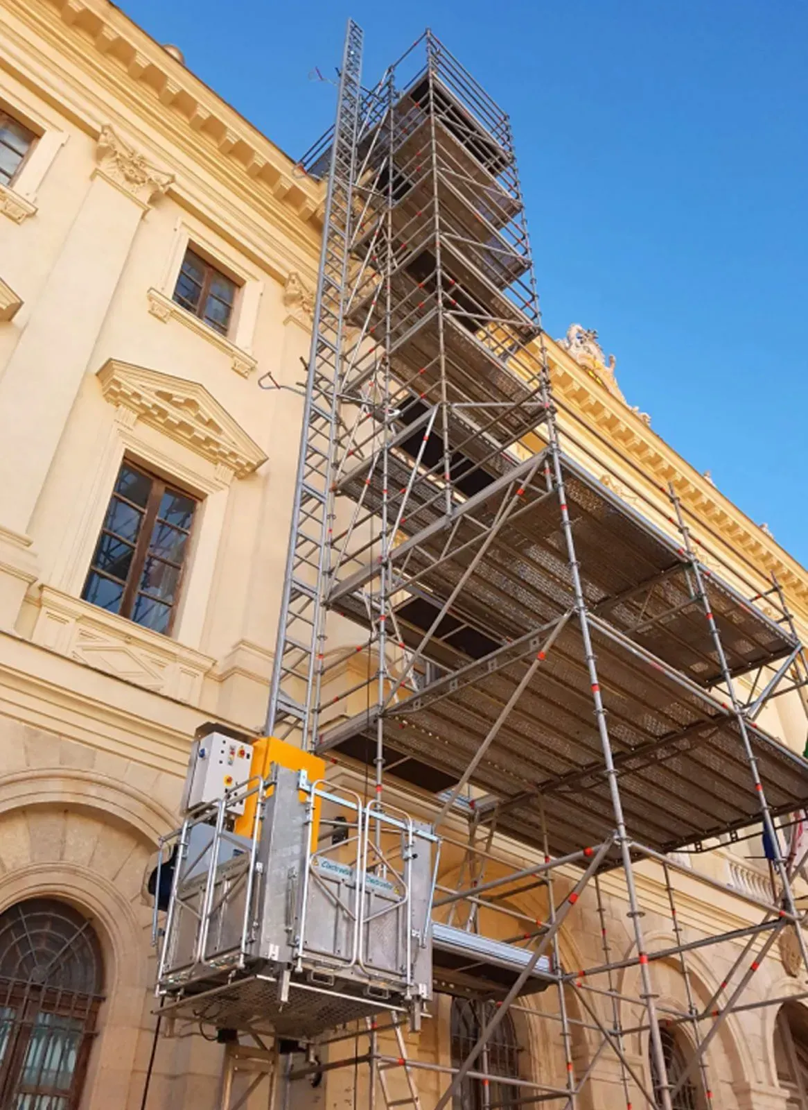 La scala elevatrici LIFT 2000 consente il sollevamento di materiali mediante l’utilizzo di un apposito carrello elevatore trainato da un cavo in acciaio su struttura modulare in alluminio con elementi di diversa lunghezza.